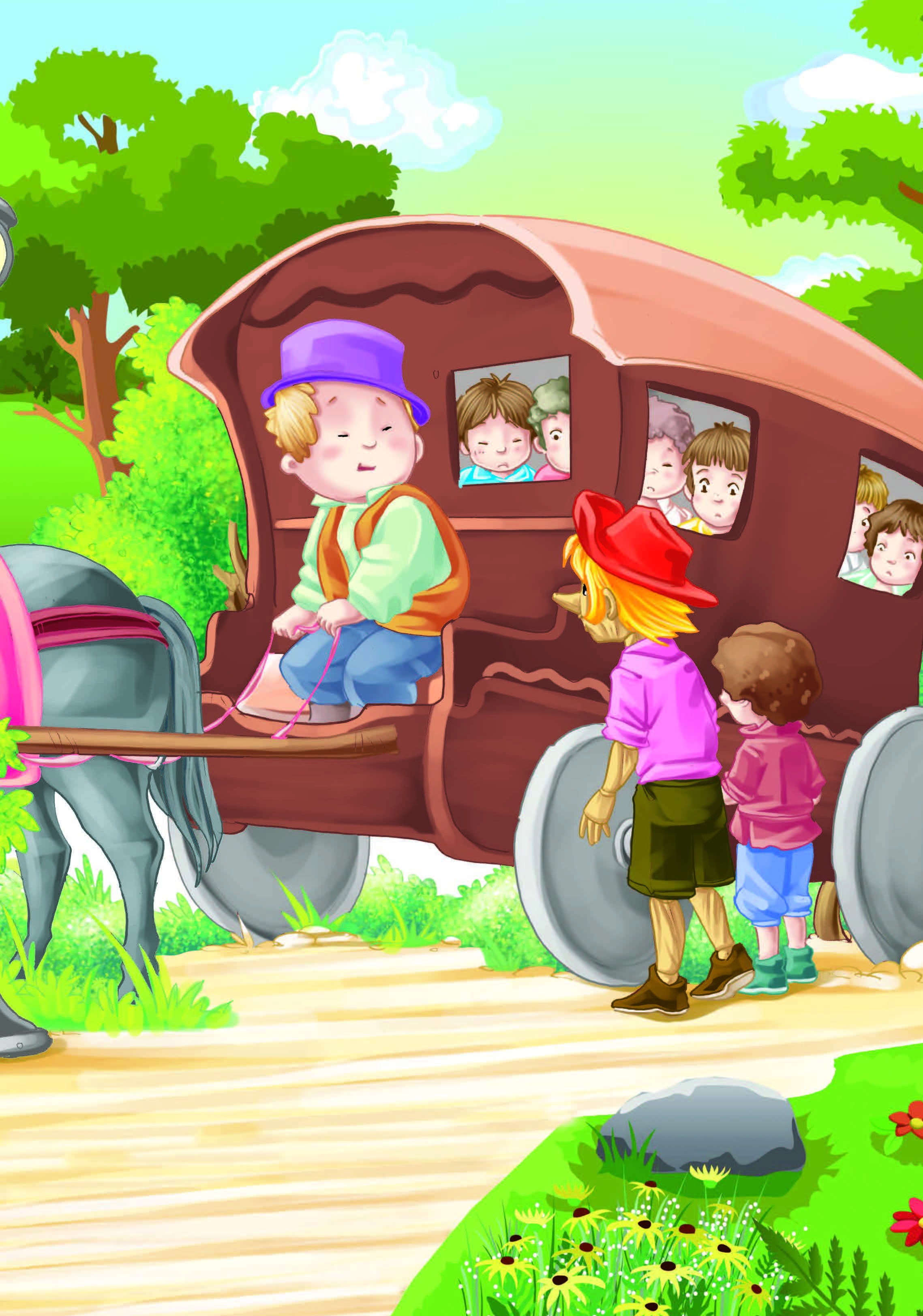 “嗨!朋友!”看到匹诺曹站在地上犹豫不决,马车里的上百个孩子们纷纷劝说他,“在学校里我们早就待腻了,快点去吧!”