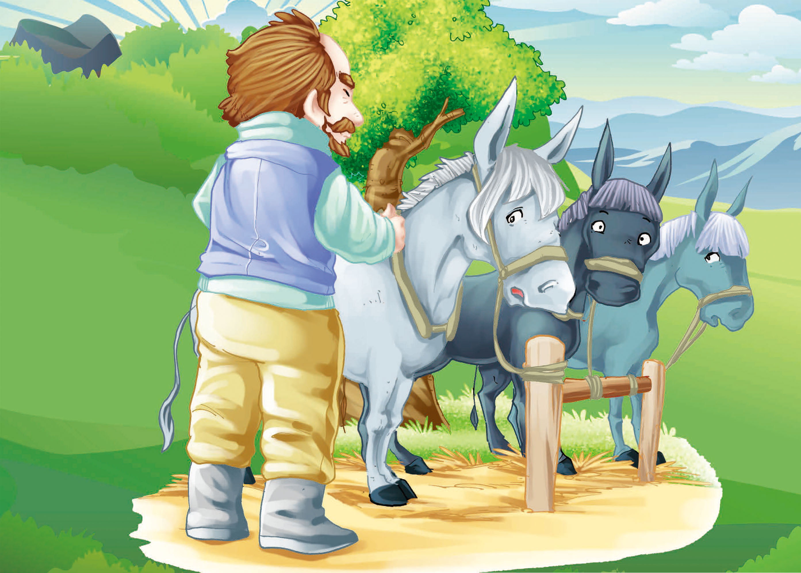 用了好长时间,矮胖子才把两头驴的毛梳好。嘿!驴子还真漂亮,浑身上下的毛整整齐齐,油亮油亮的。这时候,矮胖子又找来两根长绳,分别拴住两头驴子。然后,就要把他们牵到集市上了。